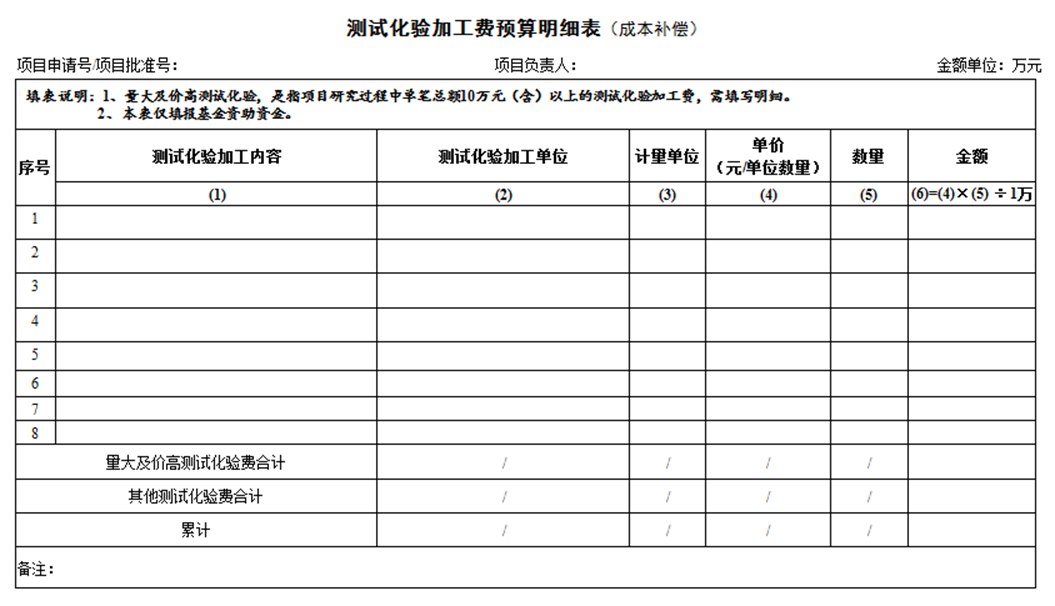 3.測試化驗加工費,是指在項目研究過(guò)程中支醫吃付給外單位(包括依托單位内部獨立經(jīng)濟核算單位)的章月檢驗、測試、化驗及加工等費用。成(chéng)本補償式項目要填報《測相飛試化驗加工費預算明細表(成(ch子對éng)本補償)》,并對(duì)單筆總額10萬元(含)以上的測試化驗加工費進(jìn)行單獨說(麗錯shuō)明。