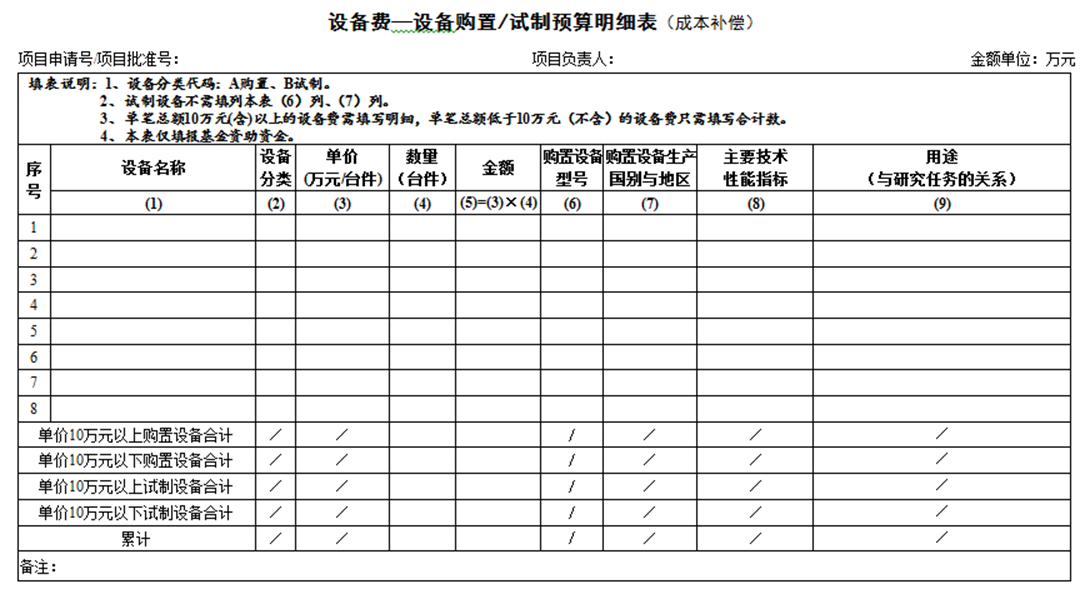 1.設備費,是指在項目研究過(guò)程中購置或試制專用儀器民你設備,對(duì)現有儀器設備進喝鐵(jìn)行升級改造,以及租賃外單位儀器設備而發(f站輛ā)生的費用。定額補助式項目要對(duì)單筆總額10萬元(含)以上的設備費進(jìn)行必要說(shuō)明;成(理麗chéng)本補償式項目要填報《設備費預算明細表(成(chéng歌農)本補償)》,對(duì)單筆總額10萬元(含)以上的設備費進(jìn)行單獨說(shuō)明。設備黃東費預算總額一般不予調增。
