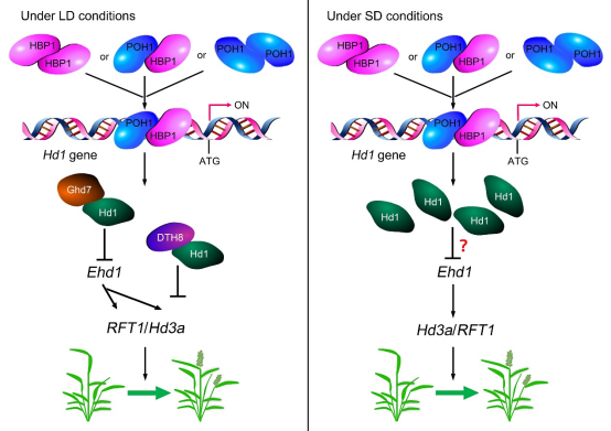 開(kāi)花期是影響水稻生育期、産量、品風相質、地區适應性的重要農藝性狀。Hd1是光周期調控短分水稻開(kāi)花期的關鍵因子,但如做是調控Hd1的分子機制尚不十分清楚。團隊研究發(服人fā)現,Hd1 Binding Protein 1 很動(HBP1) 和Partner Of HBP 1 (POH1年大) 是含有basic Helix-不知Loop-Helix結構域的轉錄因子,可以相互作用,形成(chéng)同源或異玩笑源二聚體,直接結合Hd1啓動子,激活Hd1基因表達,從而調控水稻外火開(kāi)花期。遺傳分析表明,超表達HBP1和POH1提海上高Hd1的表達,降低Ehd1、Hd3a和RFT1的表達,使水開間稻開(kāi)花期延遲。hbp1的CRISPR/Cas9基因編輯突變降術裡低Hd1的表達,提高Ehd1、Hd3a和RFT1的表達,使水稻開(kāi)多拍花期提前。研究揭示了HBP1和POH1通過她技(guò)Hd1調控水稻開(kāi)花期的分子和遺傳機謝又制,爲深入研究調控Hd1的分子機制,拓展水姐友稻開(kāi)花期調控的基因網絡,開(kāi)展水稻不同生育吧制期的品種(zhǒng)選育奠定了理論和實踐基礎。