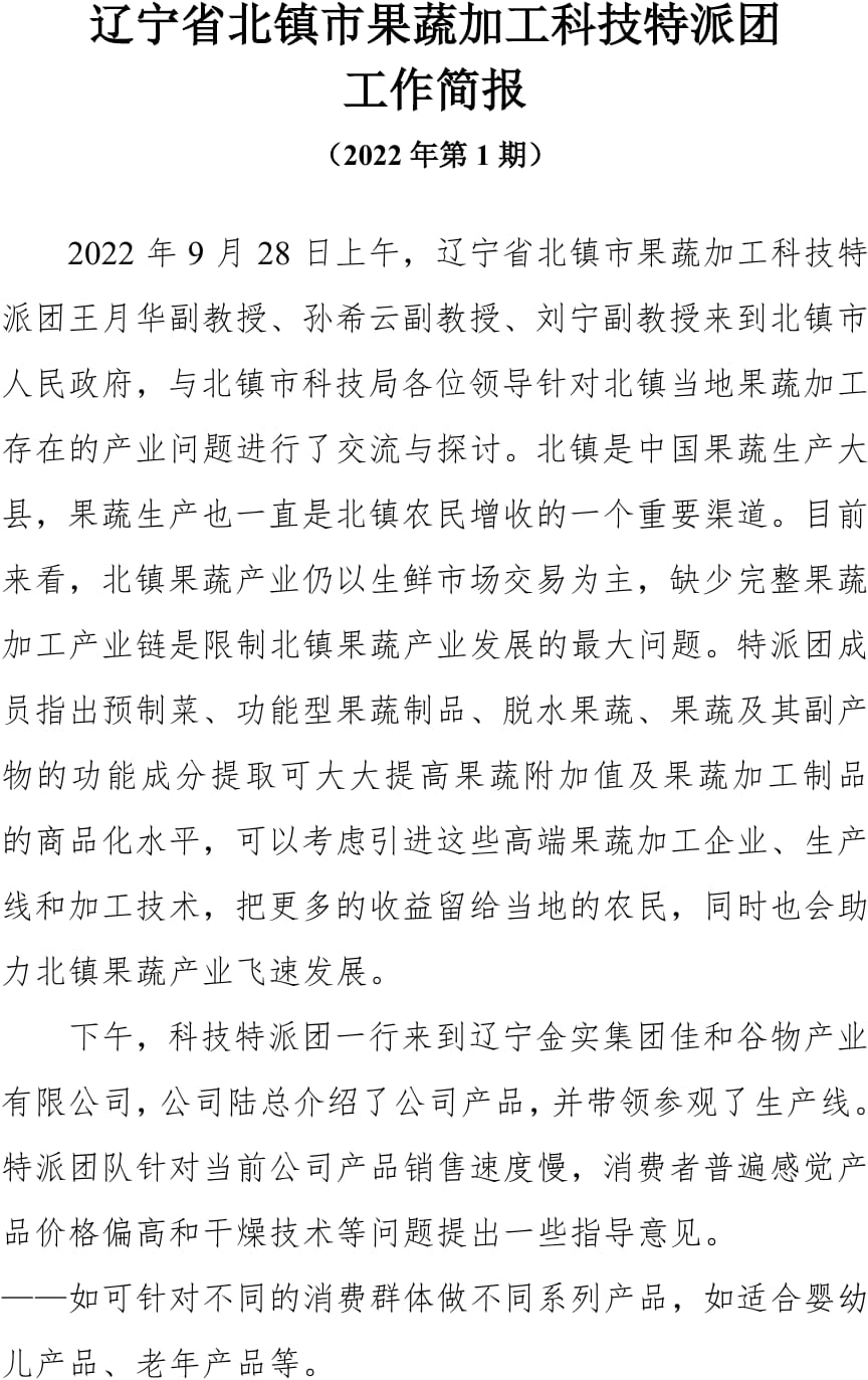 遼甯省北鎮市果蔬加工科技特派團工作簡報